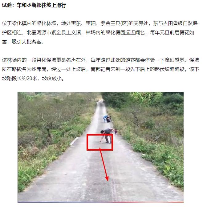 13:00饱餐之后,可以跟领队一起徒步1个小时到怪坡赏花(进入梁化林场大门后,沿着水泥路上山约8公里就是怪坡位置了,这里地名叫沙弗岗,只见一段约200多米的一个V型路面上,有心人专门用油漆在其中一面三四十米的上坡道中写了“怪坡”2个字,“怪坡”两字是顺着路面写的,怪字在下方,坡字在上方,拿一瓶水往“怪”字倒去,一会儿水会往“坡”上流,大家可以去体验一下哦)。