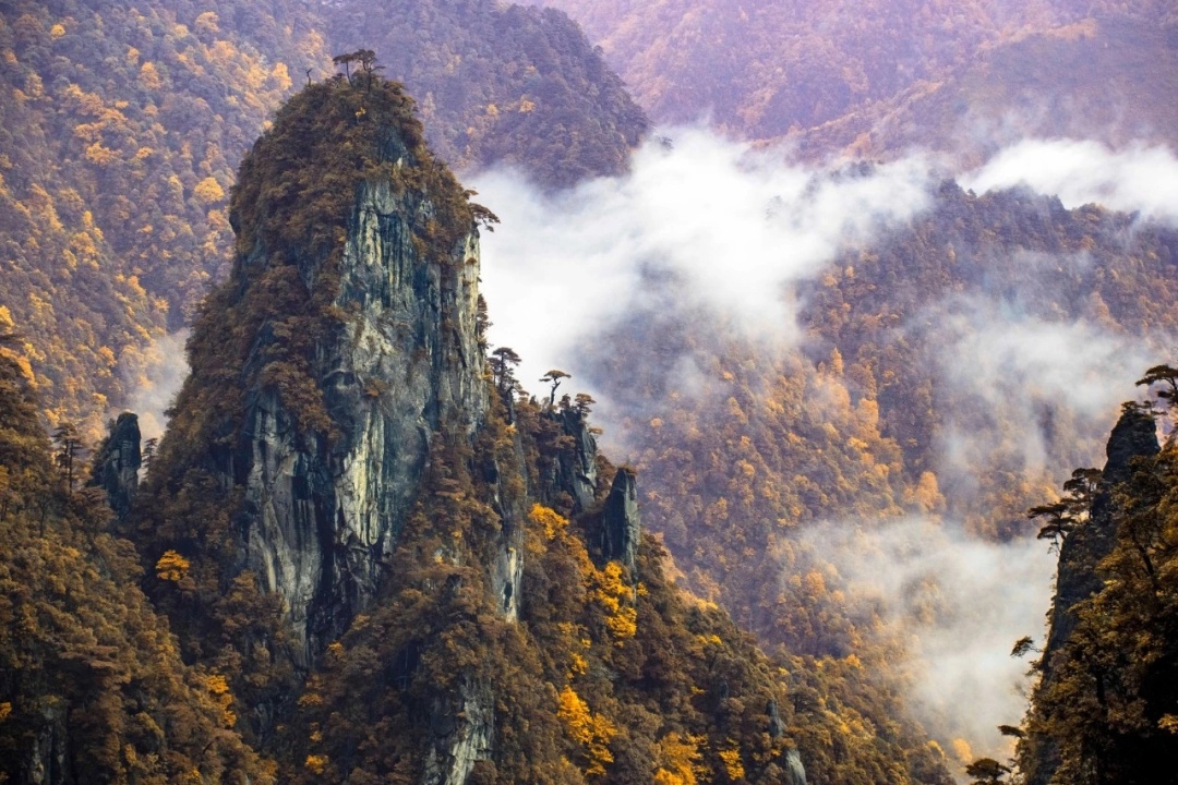 同时山谷的云雾升腾而上,