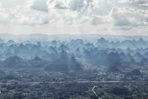 这里是典型的喀斯特峰林地貌,远处一幅气势磅礴、山峰绵延的水墨丹青版千里江山实景图映入眼帘,在夕阳辉映下如梦如幻、美不胜收。