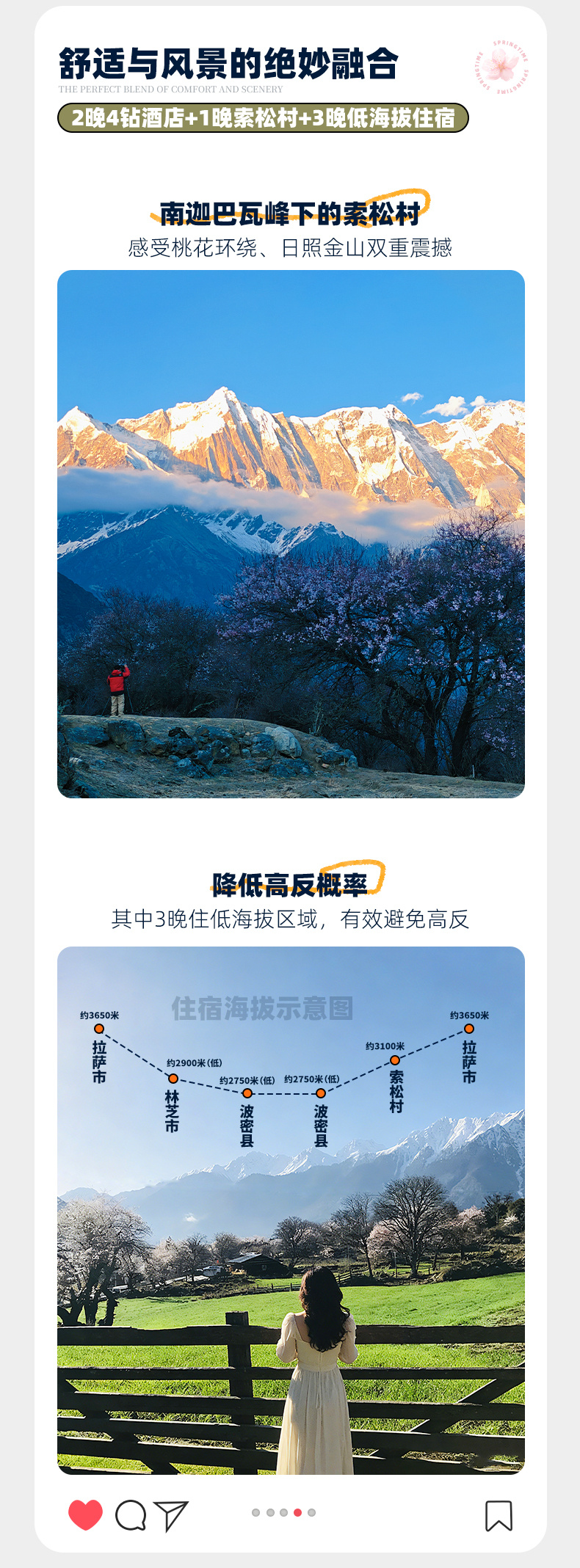 【行程概述】早餐后沿318前往【古乡湖】,古乡湖是离波密县城33公里的一个堰塞湖,由于风景优美、紧邻318线,也一直被驴友作为必游的一个休闲景点。游玩后继续西行,来到318线最精华的部分——波密至林芝段,一幅幅美景不时从车窗外飘过,保证让你惊叹。翻越色季拉山早餐后从林芝出发,沿途欣赏美丽的【尼洋河】风光,三月的尼洋河有了桃花的点缀,更是美妙绝伦。到达丹娘乡就可以看到雅江对面一个神似佛掌的沙丘。一路欣赏桃花,边走边拍,如果天气晴朗便能看到南迦巴瓦峰的倩影,而后抵达雅鲁藏布江大峡谷景区游客中心,买票后乘车前往【索松村】,这是一个与大峡谷景区隔江相望的小村落,坐落在几百米的悬崖上,下面是滔滔不绝的雅鲁藏布江,对面是“中国最美十大雪山”之首的【南迦巴瓦峰】,春暖花开正当时,粉白色的桃花肆意绽放,醉在其中。如果天气晴朗,傍晚还可以守候南迦巴瓦峰的日照金山。当夜晚来临的时刻,藏家民宿内促膝畅谈,我想,这样的夜晚,必定一生难忘!