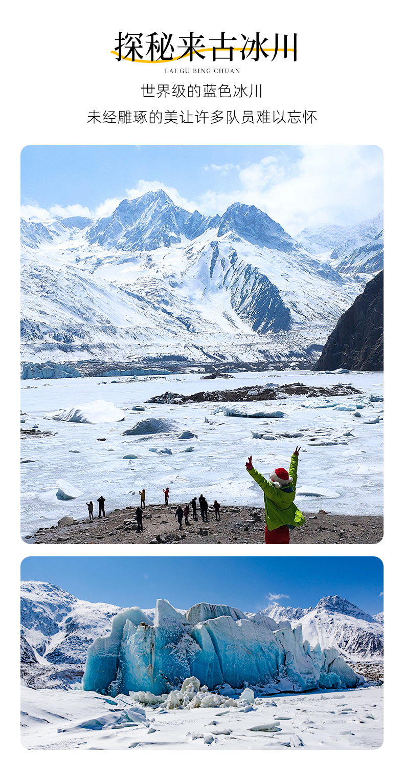 【行程概述】早餐后从波密县城出发,沿318国道向东出发,途经帕隆藏布江峡谷,沿途可观赏雪山与森林交织的壮阔景观。随后进入然乌沟,【然乌湖】是著名的高原冰川湖,是318线上的明星湖,如果运气好,可以拍到然乌湖美丽的倒影,这是摄影家们一直梦寐以求的画面。打卡后前往【来古村】赏世界级的蓝色冰川,在藏东南的雪山怀抱中,来古冰川的蓝冰在阳光下折射出幻境般的光晕,仿佛时间在此凝固,准备好迎接震撼了吗?来古绝对是我们历年来桃花线队员给予好评最多的地方,纯净带着些许蔚蓝的【来古冰川】、原始淳朴的藏式村落,如果说这个星球上真的有洗涤心灵的地方,那么一定非来古莫属了。游玩之后沿318线原路返回,傍晚抵达雪山环绕中的波密入住。