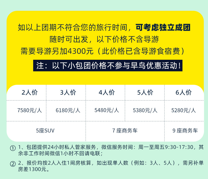 【成团说明】1人成行,20人封队,1-8人司机兼向导,9人及以上配专职导游;