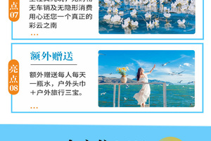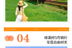 3、【体验项目】:磻溪村S弯骑行,稻田小火车,洱海旅拍费用(白天空之镜,海上钢琴,洱海之眼,天梯,花园秋千,日落之窗,咖啡屋等道具使用 ,含额外赠送每人6张简修电子照片),圣托里尼下午茶,泸沽湖篝火晚会;(备注:体验项目不退不换,不参与不退费);