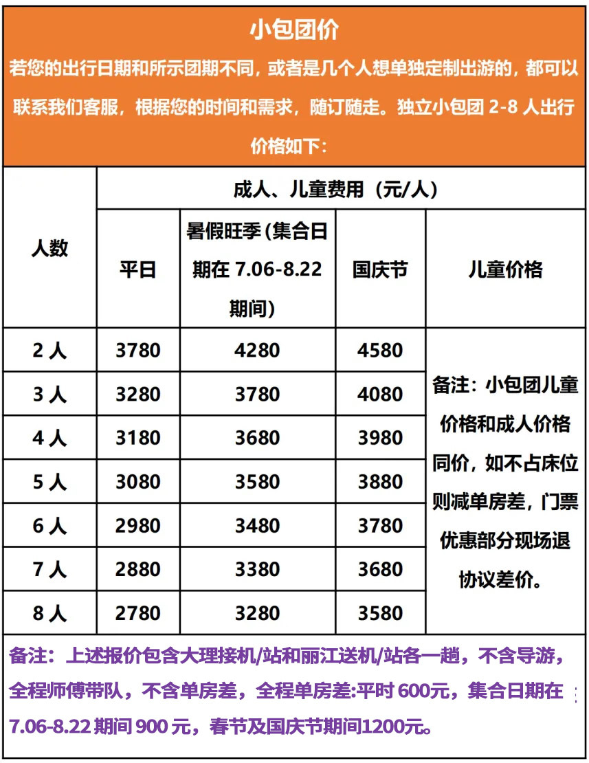 3、单房差:平常600元/人,暑假900元/人,春节及国庆旺季1200元/人。如遇单人报名我们会优先安排拼住,拼住不成的自补单房差。如遇到自己要求单住的,则需要补对应单房差费用。
